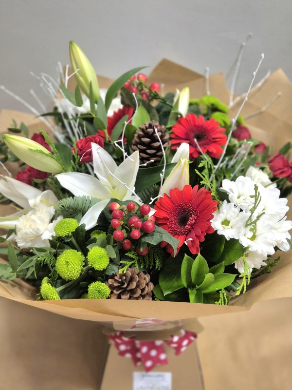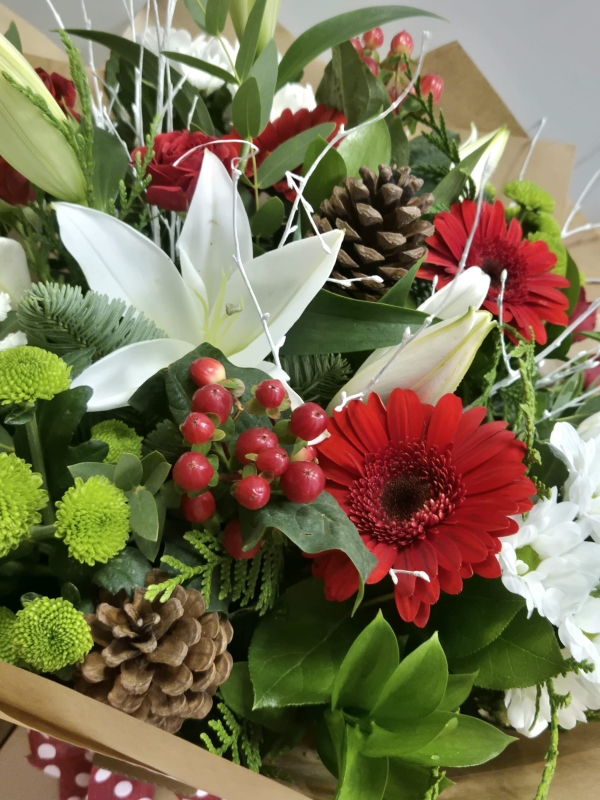 A stunning selection of festive Red, White & Green flowers, seasonal foliage and accessories to complement the flowers. A classic twist on the traditional festive colours.